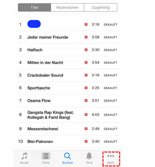 Auf Ihrem iPad: Gehen Sie zu iTunes Store > Tippen Sie auf Mehr > Tippen Sie auf Gekauft > Wählen Sie Musik > Tippen Sie auf Nicht auf dem iPad > Tippen Sie auf Alle Titel > Tippen Sie auf das Symbol Herunterladen.
