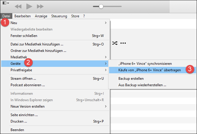 Schritt 3. Klicken Sie auf „Datei“ > „Geräte“ wählen > „Käufe von Ihrem iPod übertragen“. Die gekauften Titel werden in die iTunes-Mediathek übertragen.