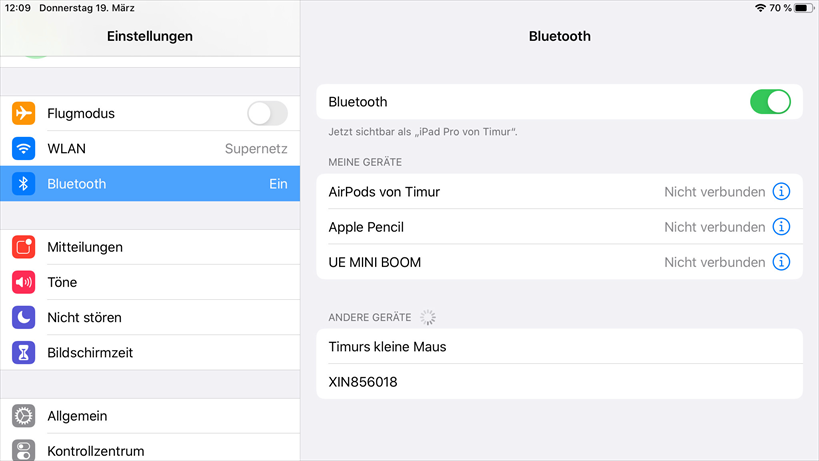Schritt 1. Aktivieren Sie auf beiden iPads Bluetooth im Kontrollzentrum oder gehen Sie zu Einstellungen > Allgemein > Bluetooth, um es zu aktivieren.