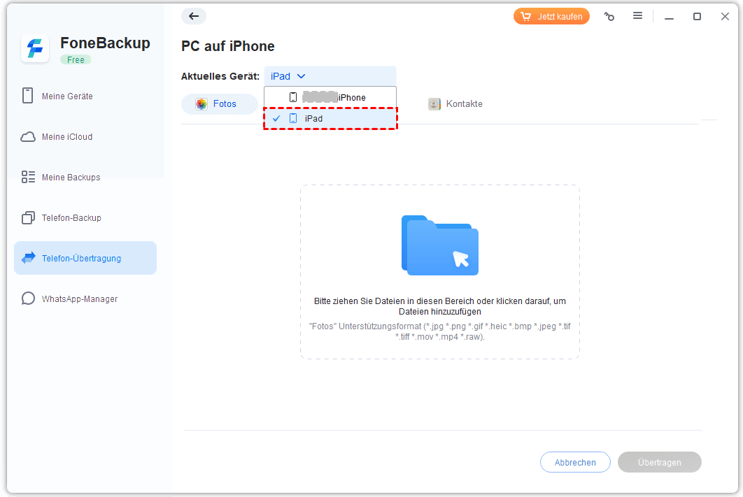 Schritt 5. Ziehen Sie das Quell-iPad ab und schließen Sie das Ziel-iPad an > Klicken Sie auf die Option „Datenübertragung“ > „PC auf iPhone“ > wählen Sie auf „iPad“ von „Aktuelles Gerät“.