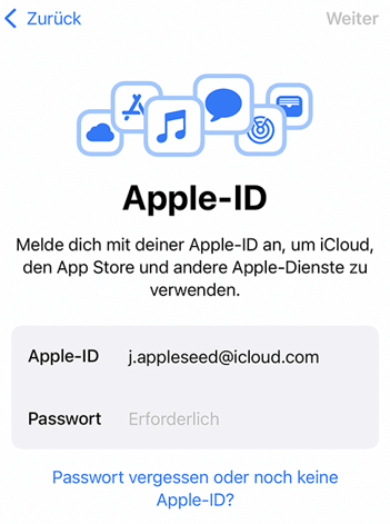 10. Geben Sie Ihre Apple-ID und Ihr Passwort ein oder tippen Sie auf Passwort vergessen oder noch keine Apple-ID? Oder Sie können es einfach überspringen und später in der Einstellungen eingeben.