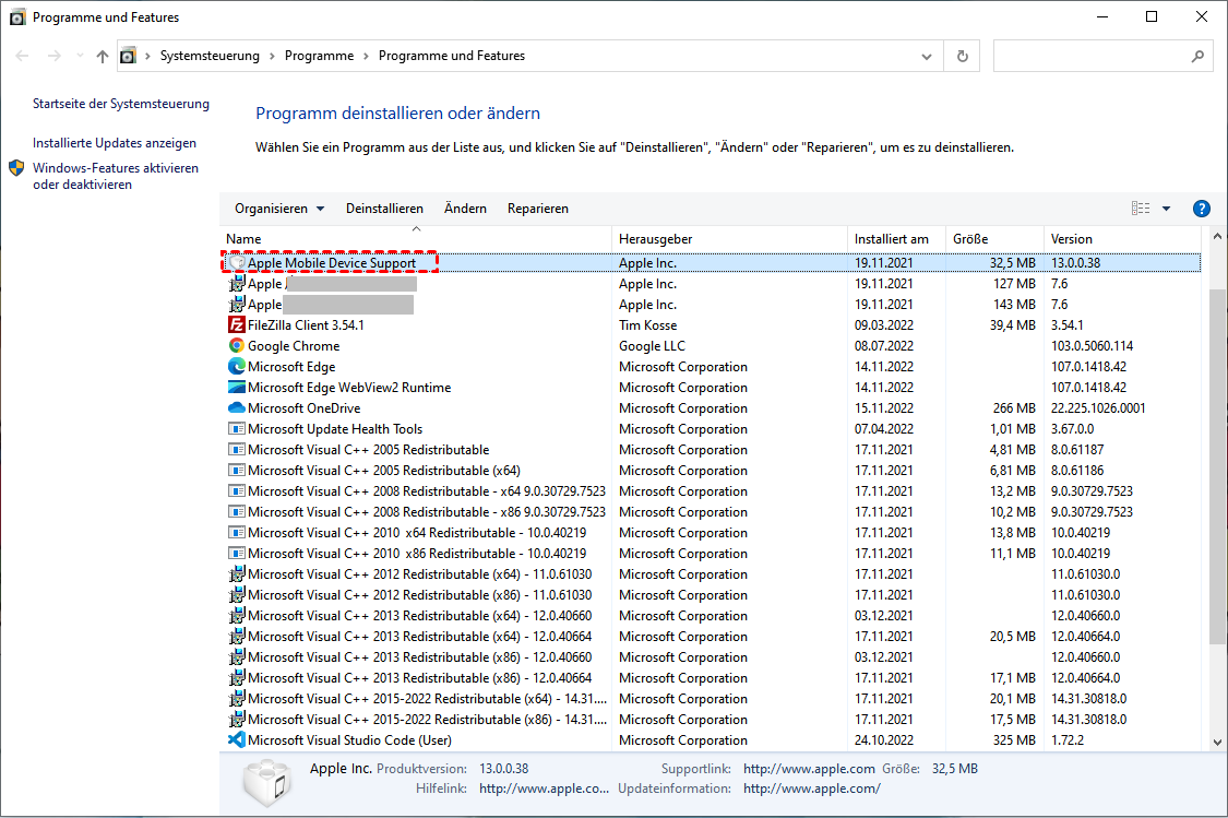 Prüfen Sie, ob Apple Mobile Device Support installiert ist