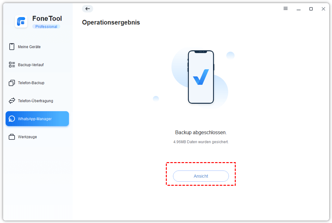 Schritt 4. Sobald die Sicherung abgeschlossen ist, klicken Sie auf „Ansicht“, um die Sicherungsdetails zu überprüfen. Und Sie können Sicherungsdaten direkt in FoneTool durchsuchen.