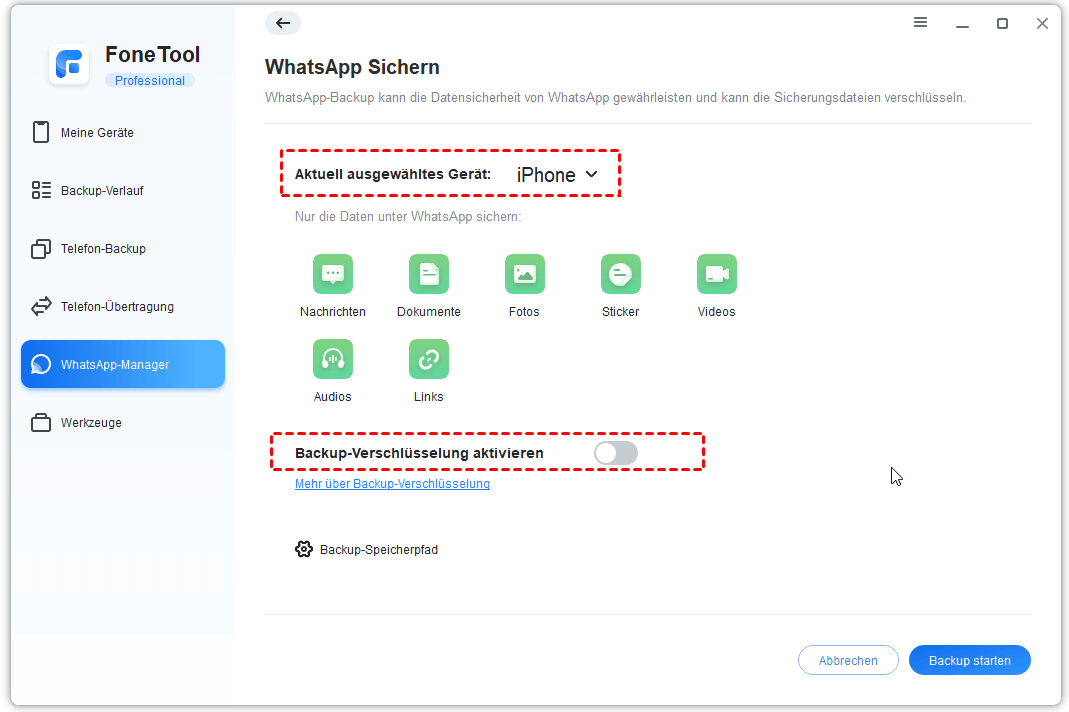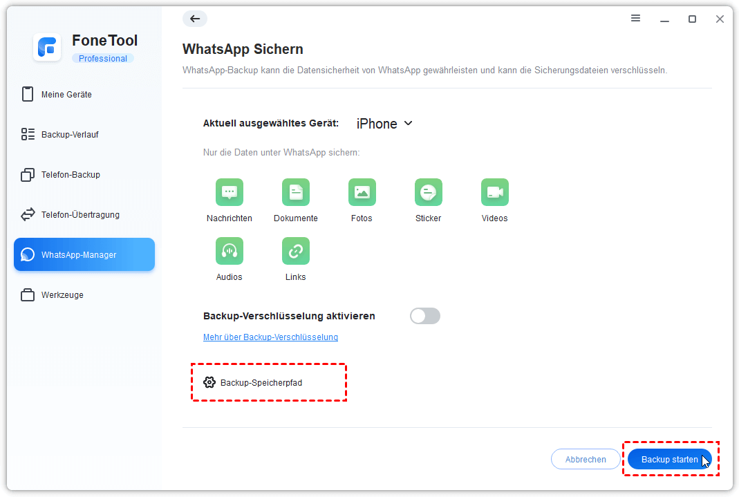 Schritt 2. Klicken Sie auf „Starten“ in der nächsten Benutzeroberfläche, die die „WhatsApp“-Datentypen auflistet, die gesichert werden können. Derzeit werden standardmäßig Sicherungsnachrichten, Dokumente, Fotos, Aufkleber, Videos, Audios und Links unterstützt.