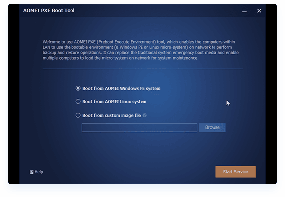 Das AOMEI PXE Boot Tool kann viele Computer von einem Mikrosystem im Netzwerk booten. Nach dem Booten können Sie das System mit Tools sichern, wiederherstellen oder warten, die mit der Image-Datei angeboten werden.
