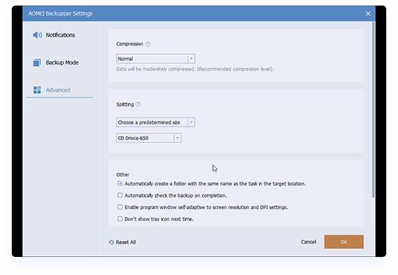 Sie können die E-Mail- oder SMS-Benachrichtigung aktivieren, den Sicherungsmodus auswählen, VSS verwenden oder die Komprimierungsstufe anpassen, Sprachen ändern usw.