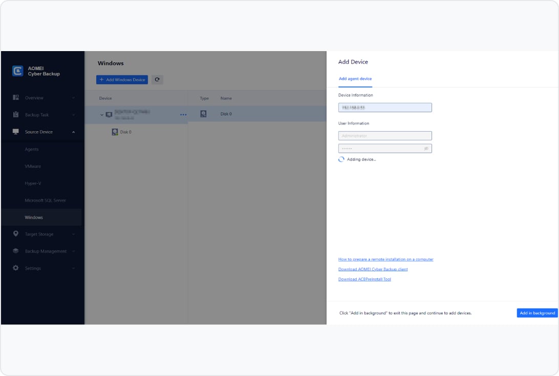 Fügen Sie ein Gerät hinzu: Klicken Sie auf „Quellgerät“ > „Windows“ > „Windows-Gerät hinzufügen“. Geben Sie Ihre Geräteinformationen ein.