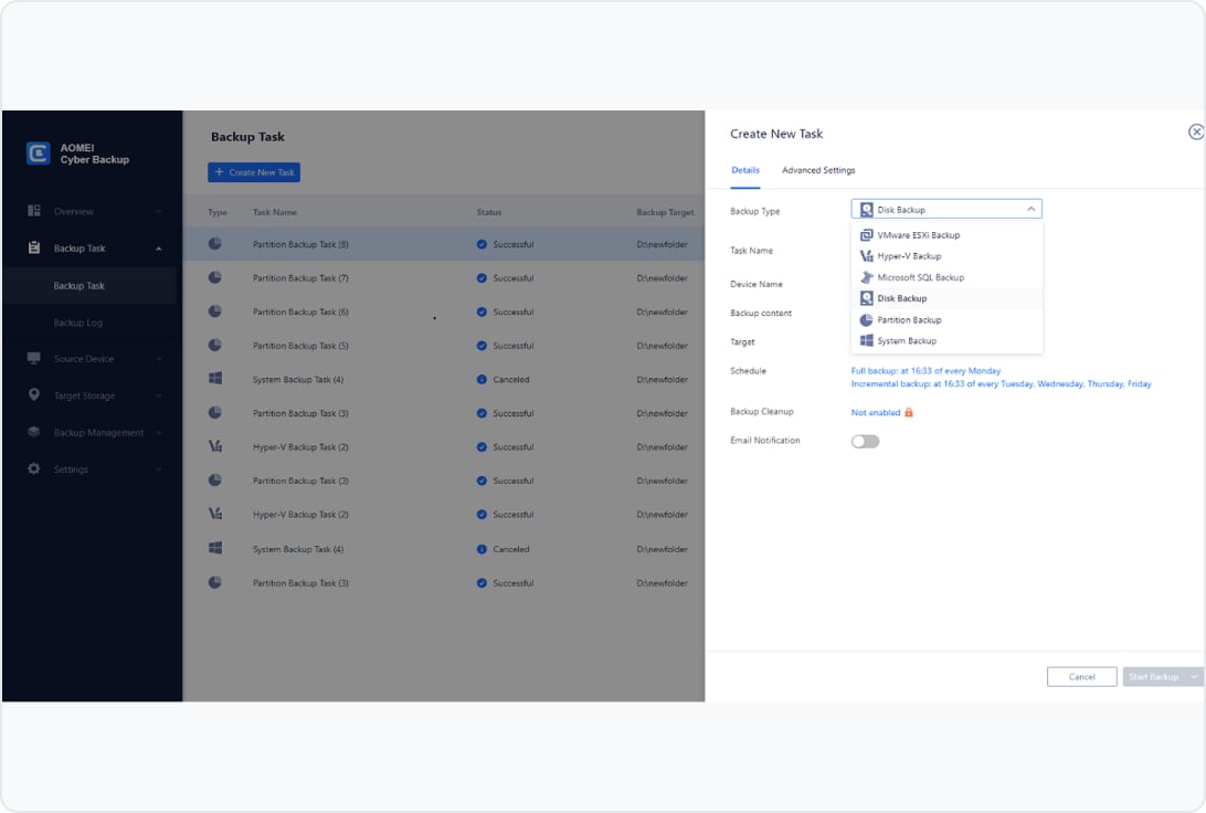 Laden Sie AOMEI Cyber Backup für Windows herunter, um Ihre VMware, Hyper-V, MSSQL Server, Windows-Workstations und Server zentral zu sichern.