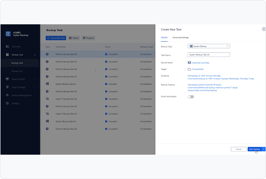 Erstellen Sie eine Sicherungsaufgabe: Klicken Sie auf „Sicherungsaufgabe“ > „Neue Aufgabe erstellen“. Geben Sie die Sicherungsdetails ein.
