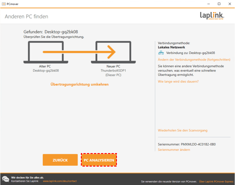 3. Nachdem die beiden PCs verbunden sind, klicken Sie auf „PC ANALYSIEREN“ auf dem neuen Computer.