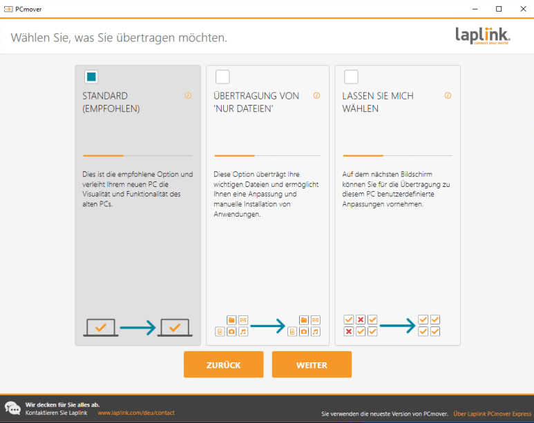 5. Wählen Sie eine der drei Übertragungsarten: STANDARD (EMPFOHLEN), ÜBERTRAGUNG VON 'NUR DATEIEN' oder LASSEN SIE MICH WÄHLEN, und klicken Sie auf „Weiter“. (wählen Sie hier die erste Option)