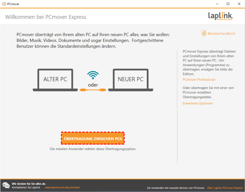 1. Führen Sie PCmover Express auf dem alten PC aus und klicken Sie im Hauptfenster auf „ÜBERTRAGUNG ZWISCHEN PCS“.