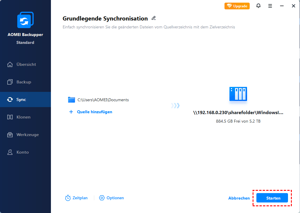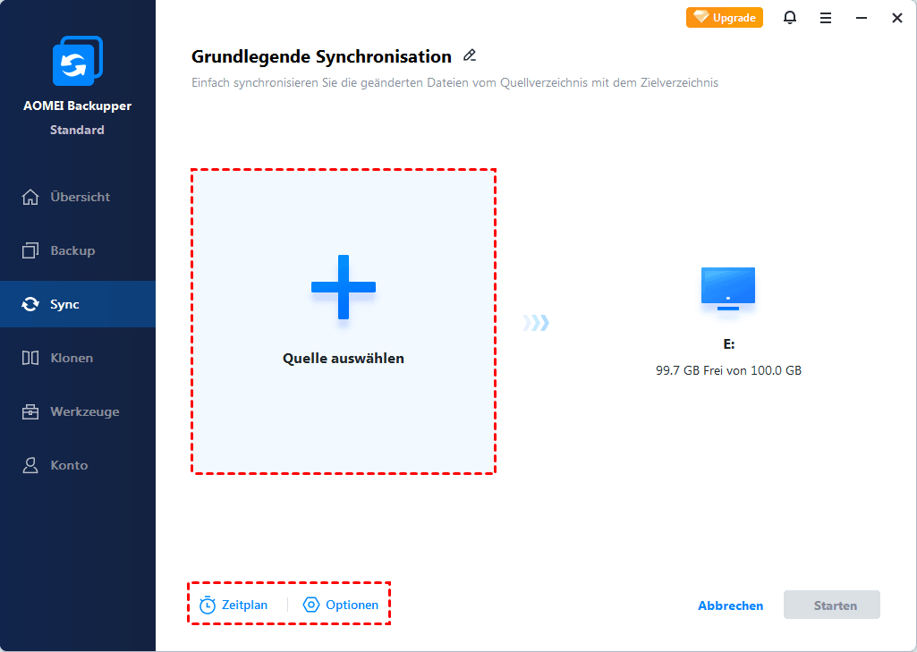 ✪ Tipp: Um in den Genuss der erweiterten Synchronisierungsmodi - Spiegelsynchronisierung, Echtzeitsynchronisierung und Zwei-Wege-Synchronisierungzu kommen, können Sie auf AOMEI Backupper Professional upgraden.