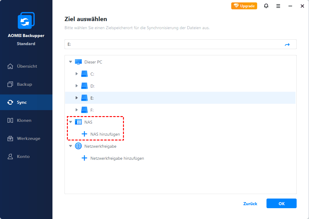 Wie Sie sehen, bietet Cloud Station Drive nur eine Zwei-Wege-Synchronisierung und eine Ein-Wege-Synchronisierung von Ihrem NAS zum PC. Wie können Sie eine Einweg-Synchronisierung von Ihrem PC zum NAS durchführen? Die beste kostenlose Dateisynchronisierungssoftware - AOMEI Backupper Standard kann Ihnen dabei helfen, einfach einen lokalen Ordner mit einem NAS-Server zu synchronisieren.