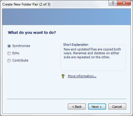 Synchronize: Synchronisierung in beide Richtungen. Wenn eine Datei in einem Ordner umbenannt oder gelöscht wird, wird diese Änderung mit einem anderen Ordner synchronisiert, in dem die gleiche Datei umbenannt oder gelöscht wird.