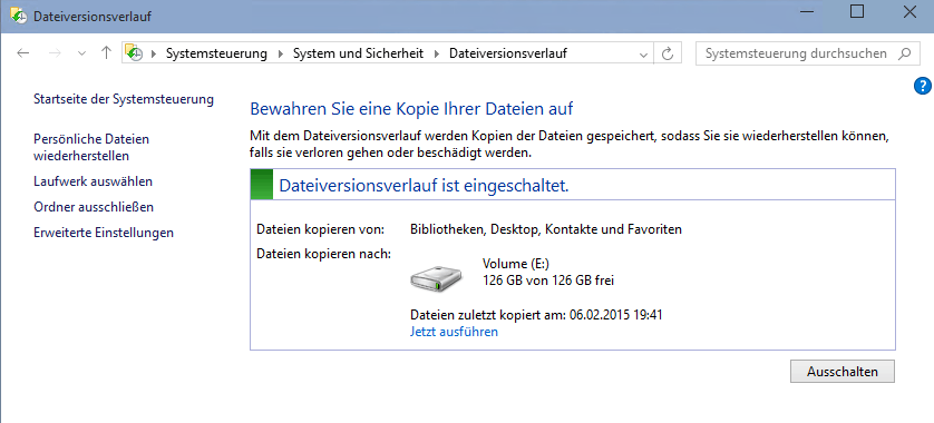 Aus dem Screenshot, können Sie nicht nur die Geschichte Datei aus Bibliotheken, Desktop, Kontakte, Favoriten und Microsoft OneDrive sehen, sondern externe Antriebsverbindung erreichen. Dann klicken sie auf "Ausschalten", um die Dateiversion zu sichern. Sie können auch die automatische Datensicherung und Systemabbildsicherung machen. Aber es ist ein bisschen schwierig mit diesem Werkzeuge für die Datensicherung und Dateisicherung nicht komprimiert wird und viel Platz in Anspruch nehmen. Und wenn Sie auf Datei Windows 10 sichern möchten, müssen Sie Daten in Bibliotheken, Favoriten hinzufügen, usw.