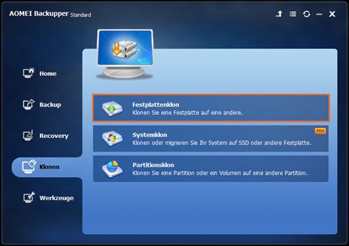 Schritt 1. Downloaden Sie AOMEI Backupper, installieren Sie es und starten Sie es. Klicken Sie auf „Klonen“ und wählen Sie dann „Festplattenklon“.