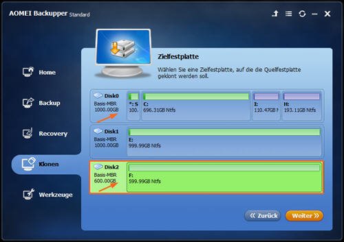 »» Sie können größere Laufwerke direkt auf kleinere Laufwerke klonen, solange die kleinere Festplatte alle Daten der Quellfestplatte aufnehmen kann.