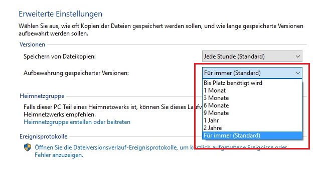 Um das gleiche Problem in Zukunft zu vermeiden, wird empfohlen, die Einstellungen für den Dateiversionsverlauf zu verbessern. Sie sollten die Aufbewahrung gespeicherter Versionen ändern. Sie können das eingestellte Zeitintervall verringern.