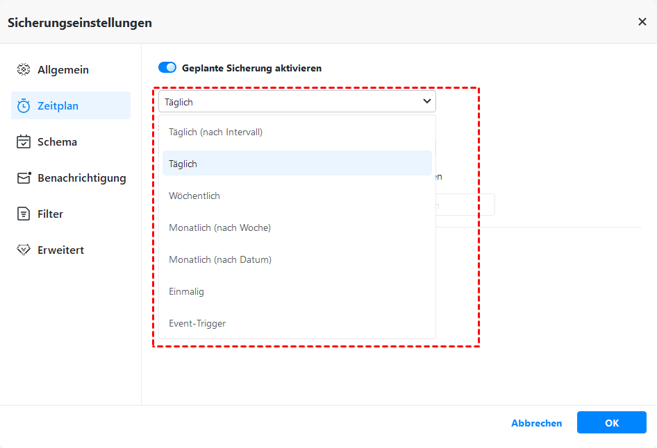 Schritt 3. Klicken Sie auf Zeitplan in der Benutzeroberfläche. Hier können Sie eine automatische Sicherung basierend auf fünf Modi einrichten: Täglich, Wöchentlich, Monatlich, Einmalig und Event-Trigger. Klicken Sie dann auf OK und kehren Sie zur Benutzeroberfläche von Dateisicherung zurück.