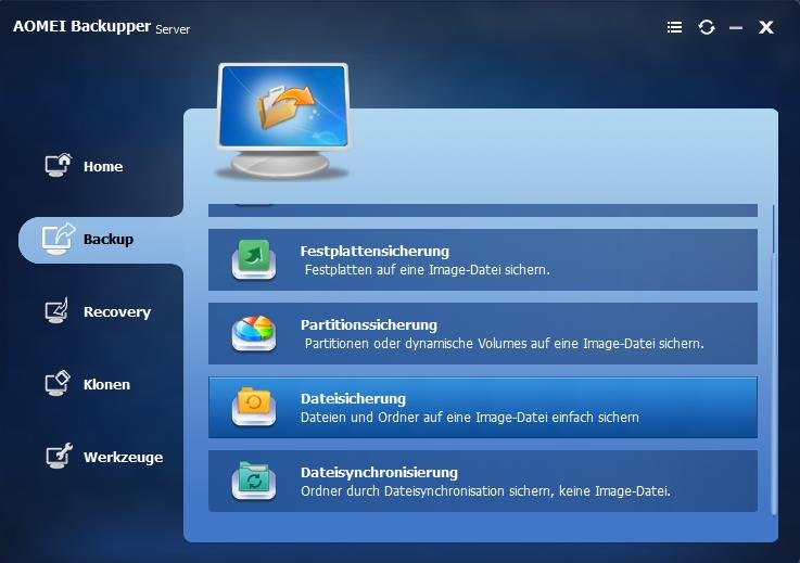 Schritt 1. Laden Sie AOMEI Backupper herunter, installieren Sie es und starten Sie es. Klicken Sie auf „Backup“ und wählen Sie „Dateisicherung“.