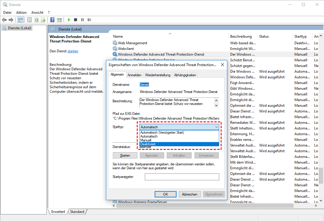 - Navigieren Sie zu den einzelnen Windows Defender-Diensten. Klicken Sie mit der rechten Maustaste auf jeden Dienst und öffnen Sie die Eigenschaften jedes Dienstes separat.