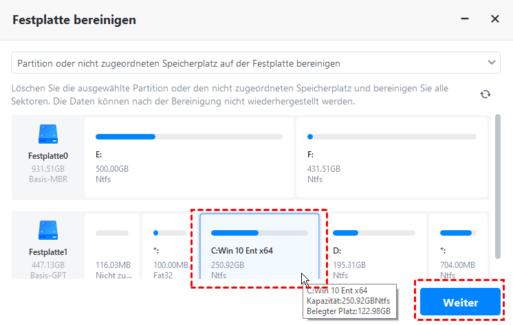 Schritt 2. Wählen Sie Festplatte bereinigen auf dem Fenster aus. Wählen Sie die Festplatte mit Windows aus, die Sie löschen möchten, und klicken Sie auf Weiter. Bestätigen Sie, dass der Vorgang einen Neustart erfordert, indem Sie auf OK klicken.