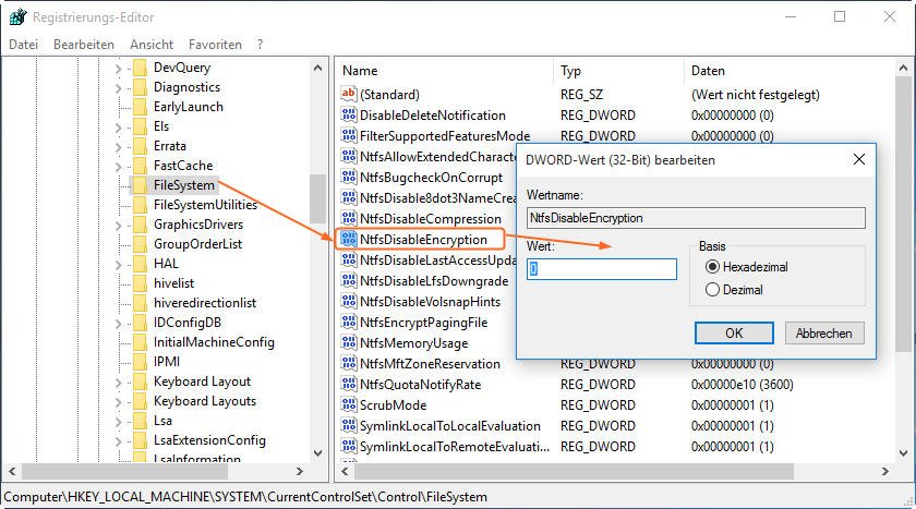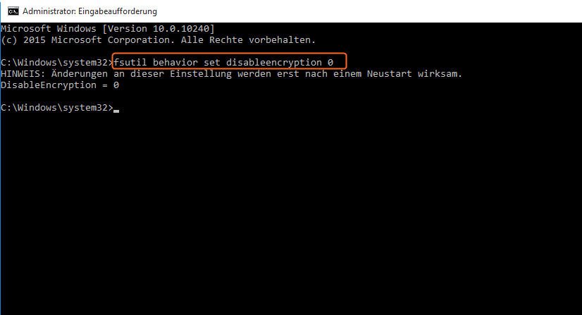 Dieser Befehl bedeutet, den Wert von NtfsDisableEncryption als 0 zu setzen.