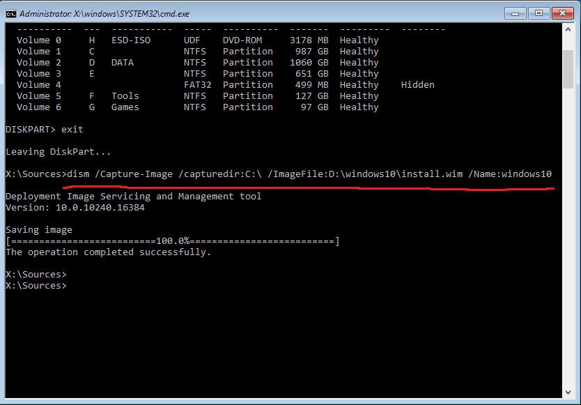 dism /Capture-Image /ImageFile:D:\windows10\install.wim /CaptureDir:C:\ /Name:windows10