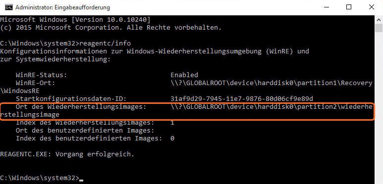 2. Führen Sie den Befehl reagentc/info aus und suchen Sie den Ort des Wiederherstellungsimages. Das Wiederherstellungsimage zeigt den WinRE-Ort an, was bedeutet, aktivieren, sonst deaktivieren.
