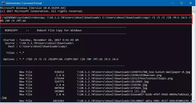 robocopy \\10.1.2.70\Users\xbox1\Downloads\ C:\Users\xbox1\Downloads\copy\ /S /E /Z /ZB /R:5 /W:5 /TBD /NP /V /MT:16
