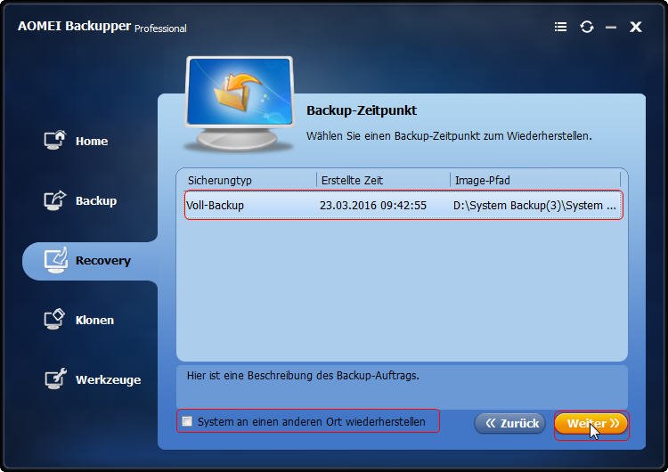 Schritt 1. Finden Sie bitte Ihr System Backup unter der Registerkarte Wiederherstellen. Dann klicken Sie auf Weiter.