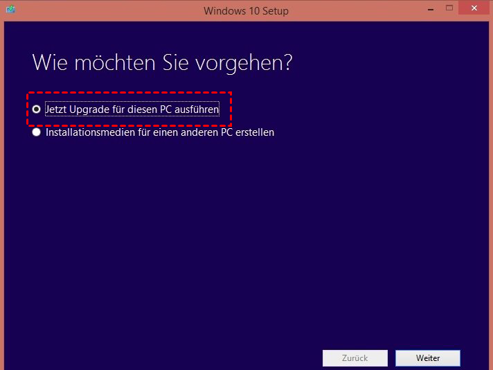 4. Im Fenster Wie möchten Sie vorgehen wählen Sie Jetzt Upgrade für diesen PC ausführen aus, und klicken Sie auf Weiter.