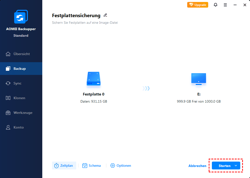 1. Führen Sie dieses Programm nach der Installation aus. Wählen Sie im Hauptfenster „Backup” > „Festplattensicherung”.