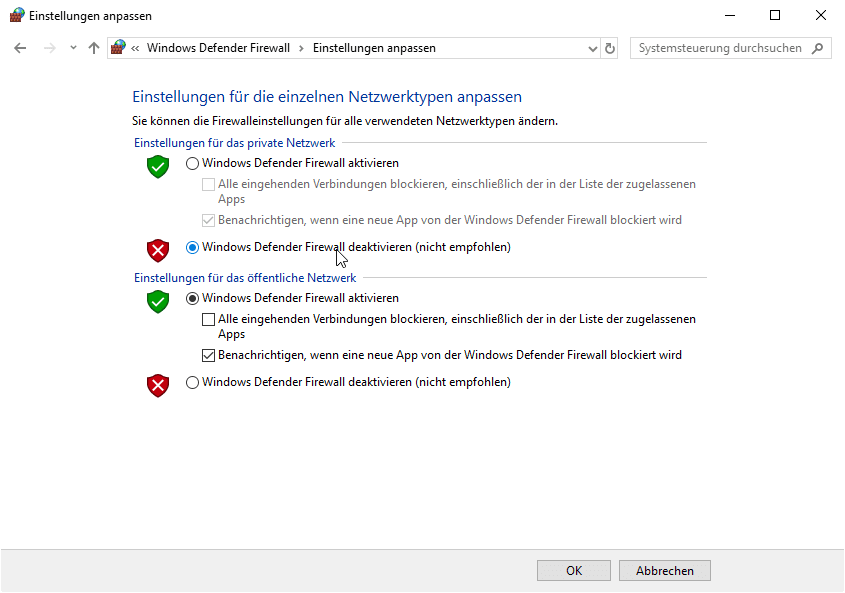 ▶ Um die Windows-Firewall zu deaktivieren, gehen Sie zu Systemsteuerung, dann zu System und Sicherheit und dann zu Windows Defender Firewall. Klicken Sie auf die Option Windows Defender Firewall ein- oder ausschalten und wählen Sie die Option Windows Defender Firewall deaktivieren (nicht empfohlen) in den Einstellungen für private/öffentliche Netzwerke. Klicken Sie abschließend auf OK.