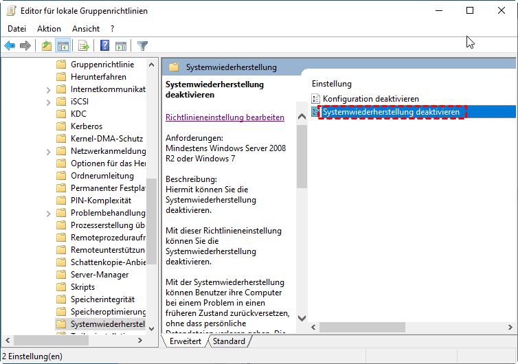 2. Gehen Sie zu Computerkonfiguration > Administrative Vorlage > System > Systemwiederherstellung.