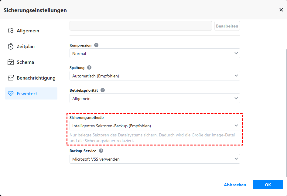 Schritt 3. Klicken Sie auf Optionen und wählen Sie Microsoft VSS verwenden aus. Wenn das VSS Probleme hat, können Sie die integrierte Technologie von AOMEI verwenden, um eine Sicherungskopie zu erstellen, ohne den Computer zu unterbrechen und neu zu starten.