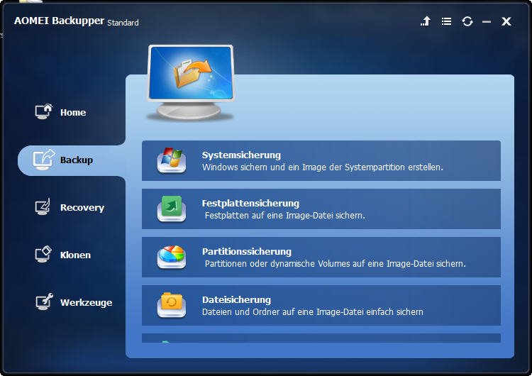 - Verschiedene Sicherungslösungen - Es kann nicht nur das System, sondern auch bestimmte Dateien, Partitionen und sogar die gesamte Festplatte sichern.