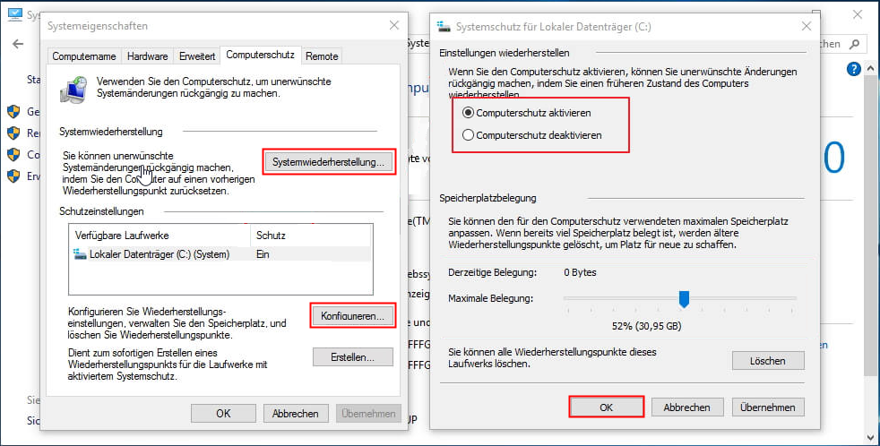 Schritt 2. Klicken Sie auf die Schaltfläche „Konfigurieren“ > „Computerschutz aktivieren“. Mit dem Schieberegler können Sie den verwendeten Speicherplatz ändern (5% bis 10% sind normalerweise ausreichend). Klicken Sie zur Bestätigung auf „OK“.