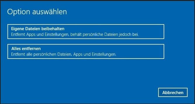 Wenn Sie „Eigene Dateien behalten“ auswählen, wird der Computer in die Windows-Wiederherstellungsumgebung (WinRE) starten, alle Ihre Dateien und persönlichen Einstellungen werden gescannt und gespeichert, eine neue Kopie von Windows mit Windows-Wiederherstellungsabbild wird installiert und dann Ihre persönlichen Dateien und Einstellungen werden zurück gelegt, wo sie gefunden wurden.