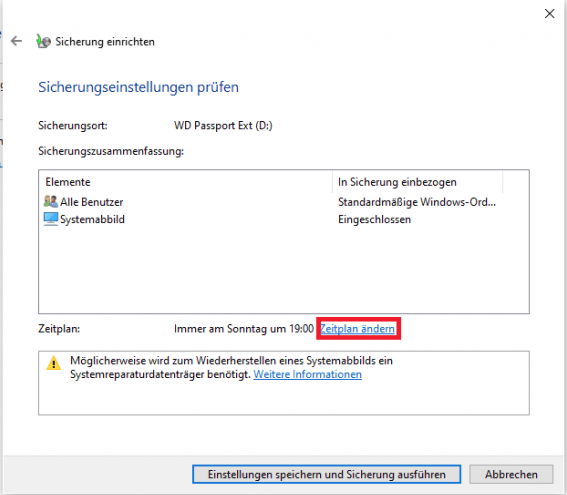 4. Im Fenster „Sicherungseinstellungen prüfen" wird die Option Zeitplan ändern angezeigt. Sie können die Standardeinstellungen beibehalten oder den Zeitplan ändern. Klicken Sie dann auf Einstellungen speichern und Sicherung ausführen.