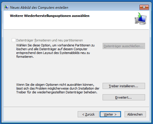 4. Vergewissern Sie sich, dass die Option Datenträger formatieren und neu partitionieren aktiviert ist, da Sie das Systemabbild auf einer anderen SSD wiederherstellen, und klicken Sie dann auf Weiter.