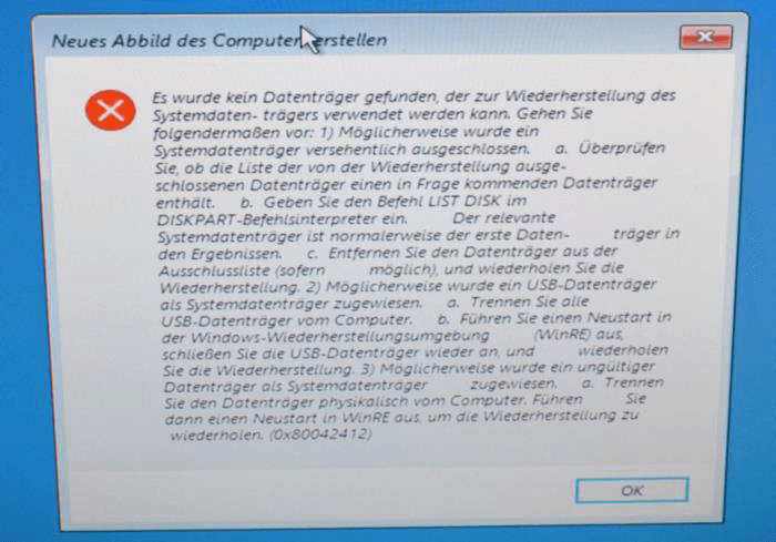 Und das ist nicht der einzige mögliche Fehler. Sie können auch im Wiederherstellungsprozess die Meldungen „Es wurde kein Datenträger gefunden......“ (Fehler 0x80042412), „Ein Systemabbild kann von Windows nicht auf einem Computer mit anderer Firmware wiederhergestellt werden“, „Windows Sicherung wurde nicht erfolgreich abgeschlossen“ usw. treffen.