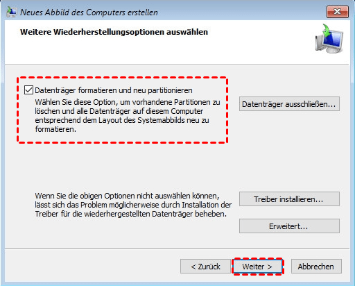 Schritt 4. Wählen Sie die gewünschten Einstellungen und klicken Sie auf Weiter. Wählen Sie dann „Computerreparaturoptionen > „βββββββProblembehandlung > „βββββββSystemimage-Wiederherstellung > „Windows 10 nachträglich.