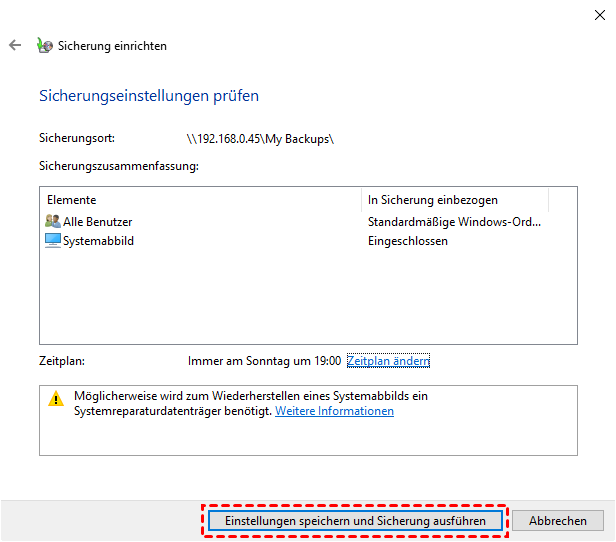 Schritt 7. Klicken Sie auf „Einstellungen speichern und die Sicherung ausführen“, um Ihre erste Sicherung auszuführen.
