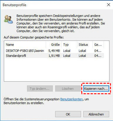 Wenn Sie keine Image-Datei benötigen und nur das Benutzerprofil in Windows 10 auf anderes Laufwerk oder einen anderen Computer kopieren möchten, können Sie die zweite Methode verwenden, die viel einfacher ist. Windows bietet ein integriertes Tool, um Benutzerprofil zu kopieren, löschen und migrieren.