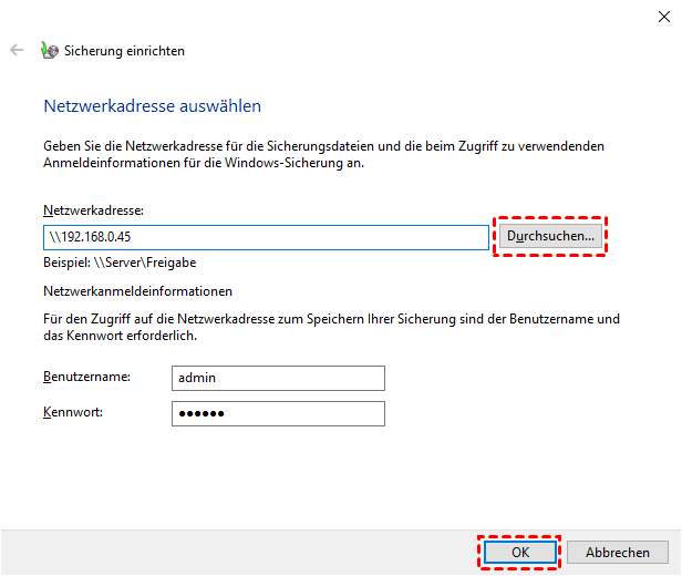 Schritt 4. Klicken Sie auf Durchsuchen und wählen Sie ein Netzlaufwerk oder einen NAS aus, indem Sie den Netzwerkadresse hinzufügen. Geben Sie dann Ihren Benutzernamen und Ihr Kennwort ein. Klicken Sie auf OK.