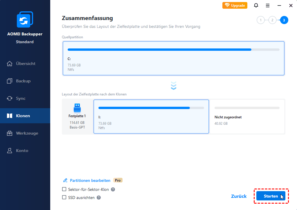 Schritt 4. Schließlich klicken Sie auf „Starten“, um das Partition-Klonen zu starten. Und warten Sie wenige Zeit, bis der Prozess abgeschlossen ist.