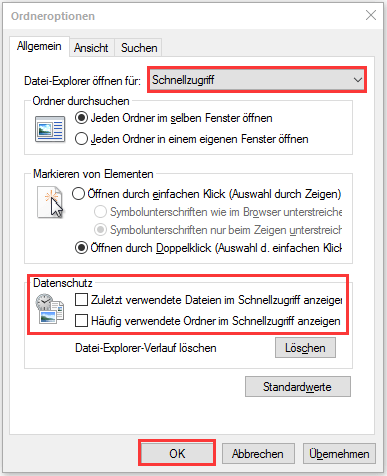 Schritt 2. Deaktivieren Sie auf der Registerkarte Allgemein die folgenden beiden Optionen – Zuletzt verwendete Dateien im Schnellzugriff anzeigen und Häufig verwendete Ordner im Schnellzugriff anzeigen.