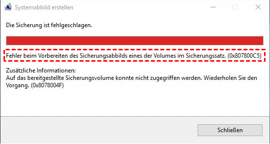 Fehler beim Vorbereiten des Sicherungsabbilds eines der Volumes im Sicherungssatz. (0×807800C5)“